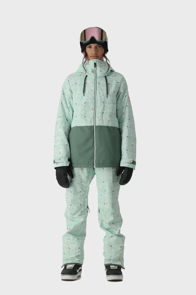 The 686 Women's Athena Insulated Jacket 2025 is primarily light teal with a darker green bottom half and has an insulated hood.