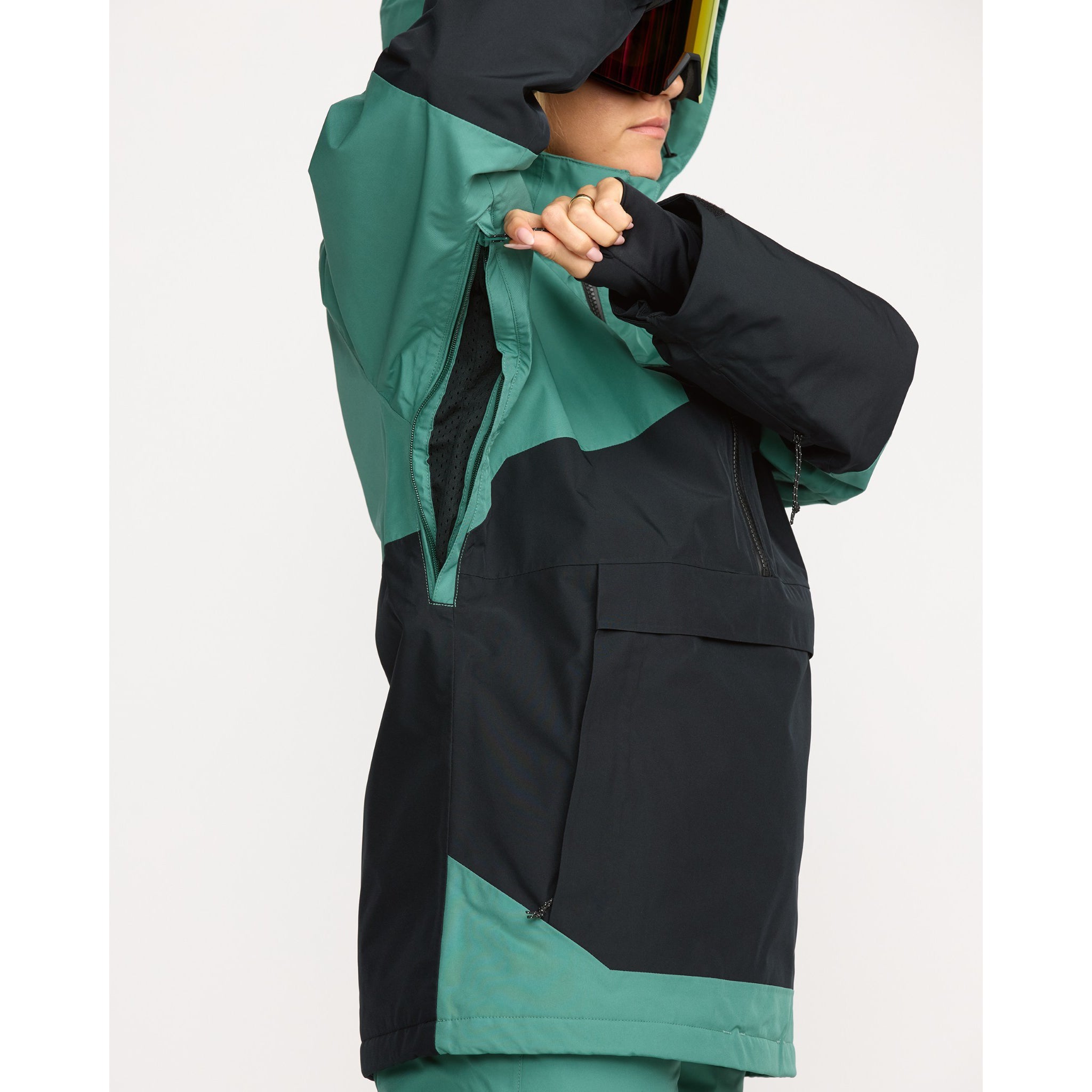 - Brushed tricot-lined hand pockets + media, pass, and goggle pockets