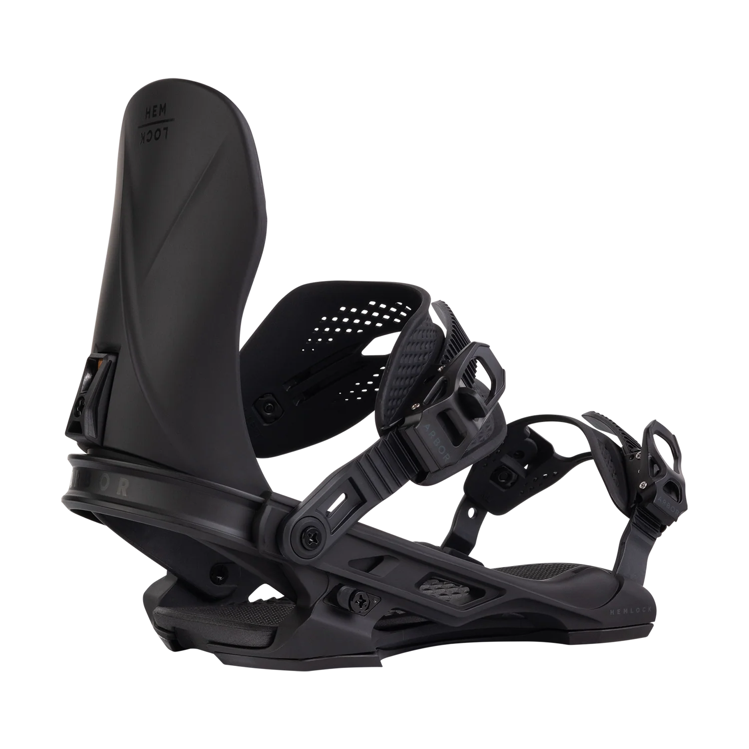 Arbor Hemlock Boss Dog Snowboard Binding - A black snowboard binding with a textured strap and a white baseplate.