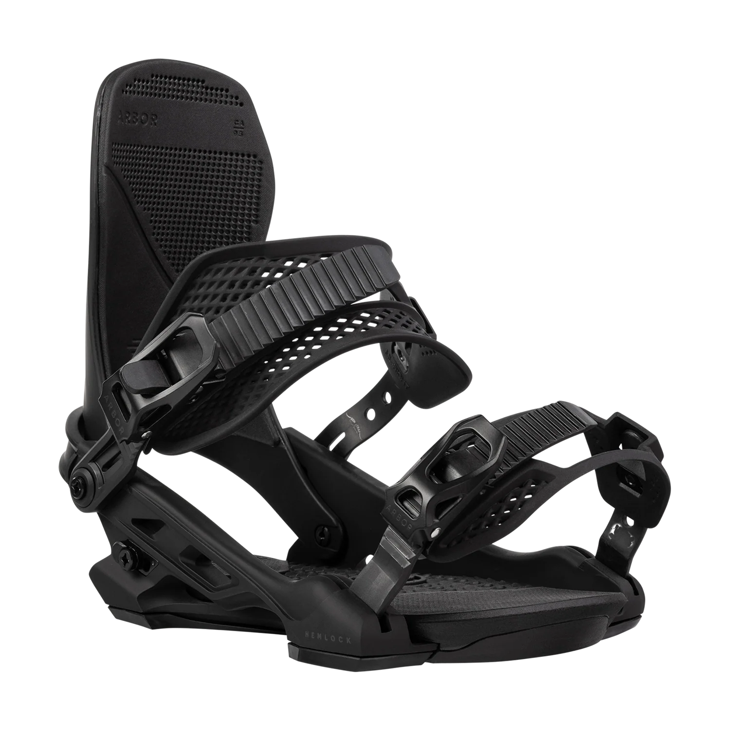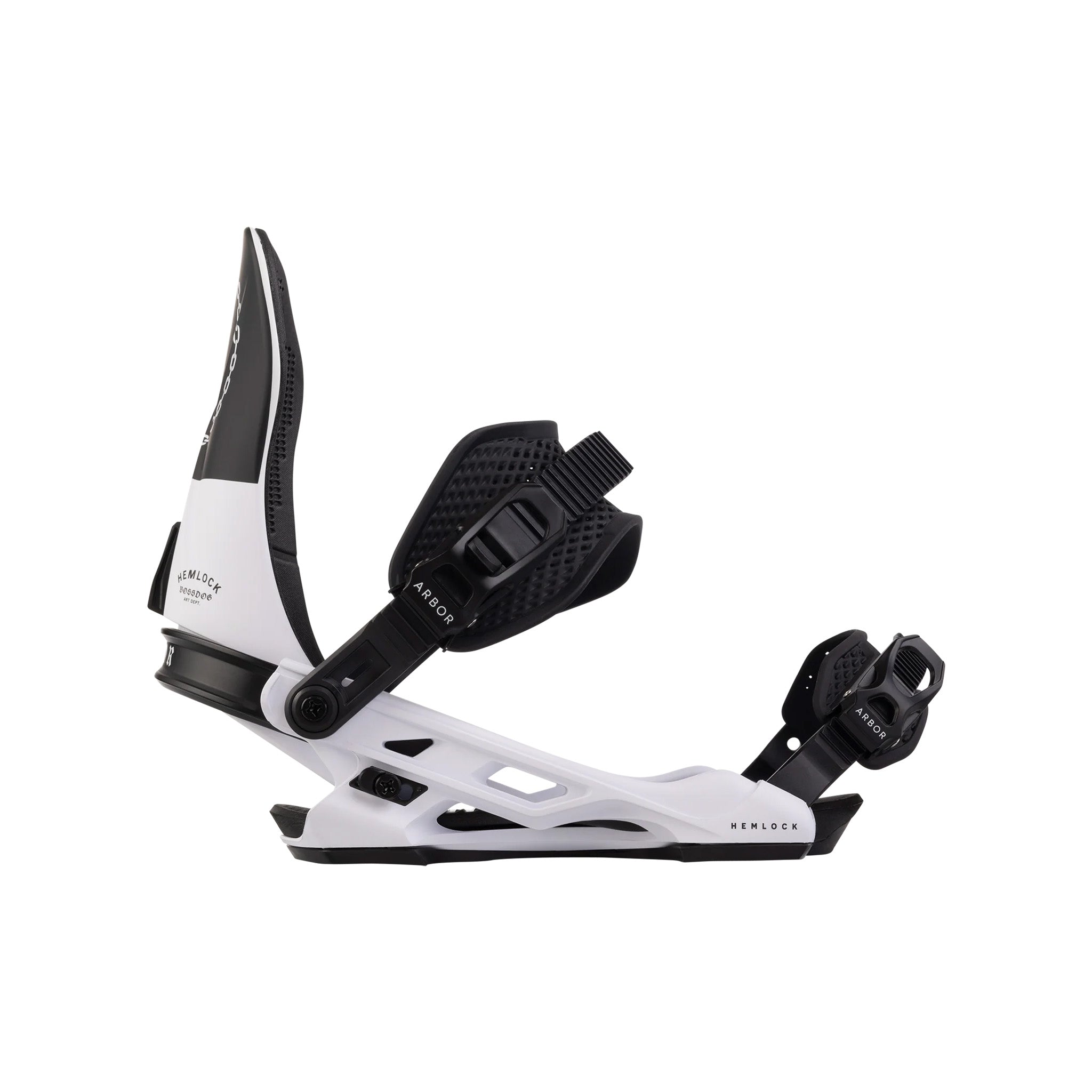 Arbor Hemlock Boss Dog Snowboard Binding 2025 - A black and white snowboard binding with a textured pattern on the straps.