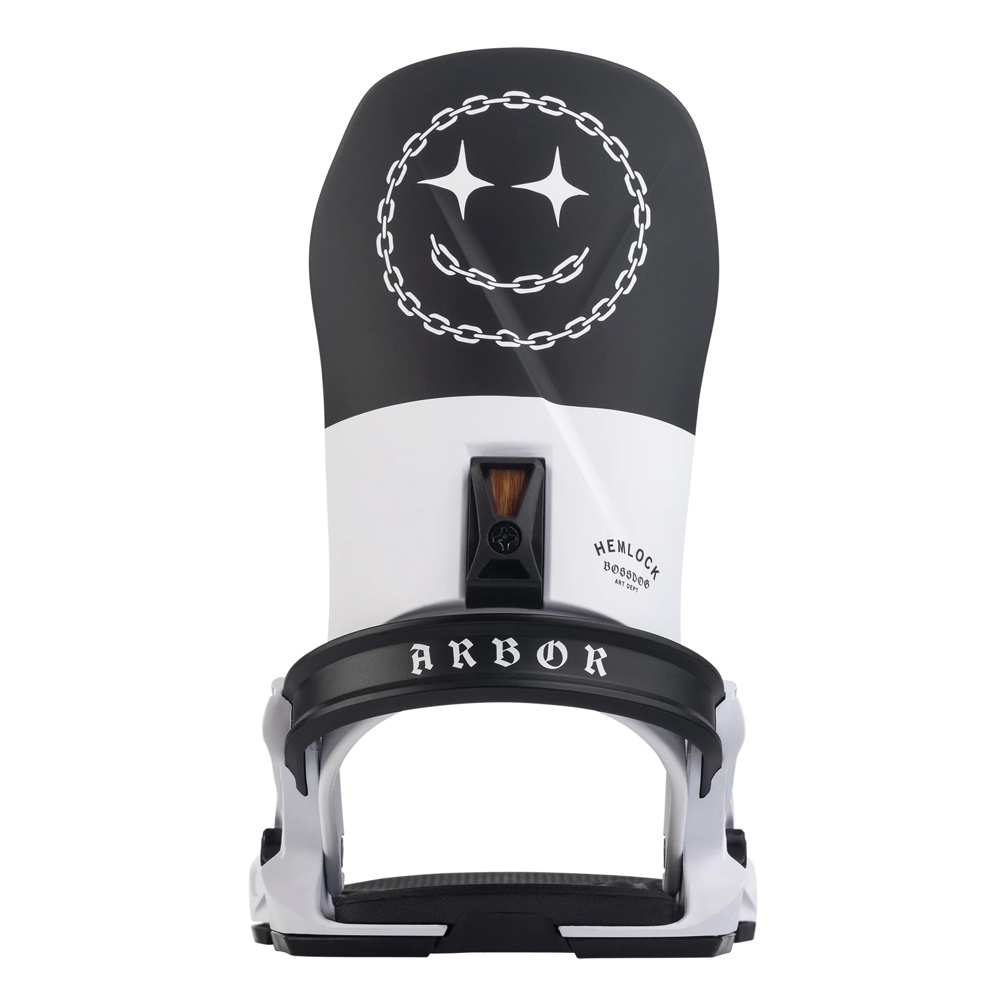 Arbor Hemlock Boss Dog Snowboard Binding 2025 - A black and white snowboard binding with a chain-link circle logo on top, featuring three sparkles in the center.
