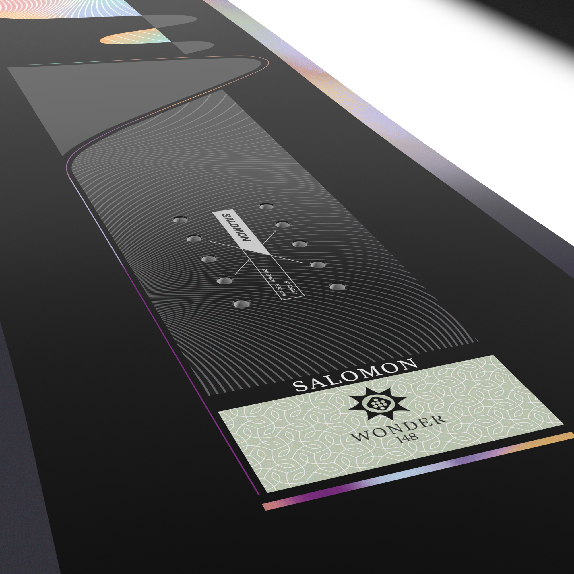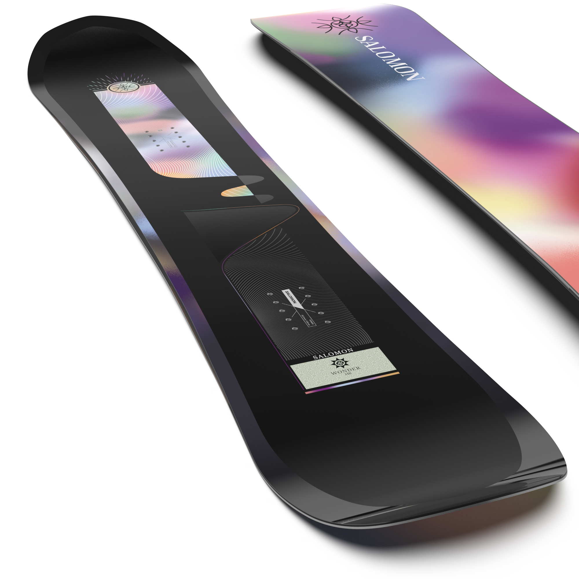Salomon Women's Wonder Snowboard 2026 - A black snowboard with a white logo and a rainbow-colored design on its top surface.
