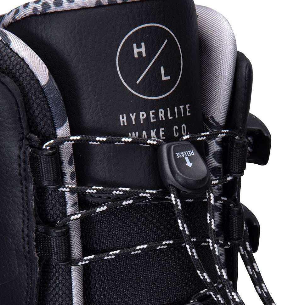 Hyperlite Remix Wake Bindings 2023 - A black binding with a white logo on the side and a strap that wraps around the top of the foot.