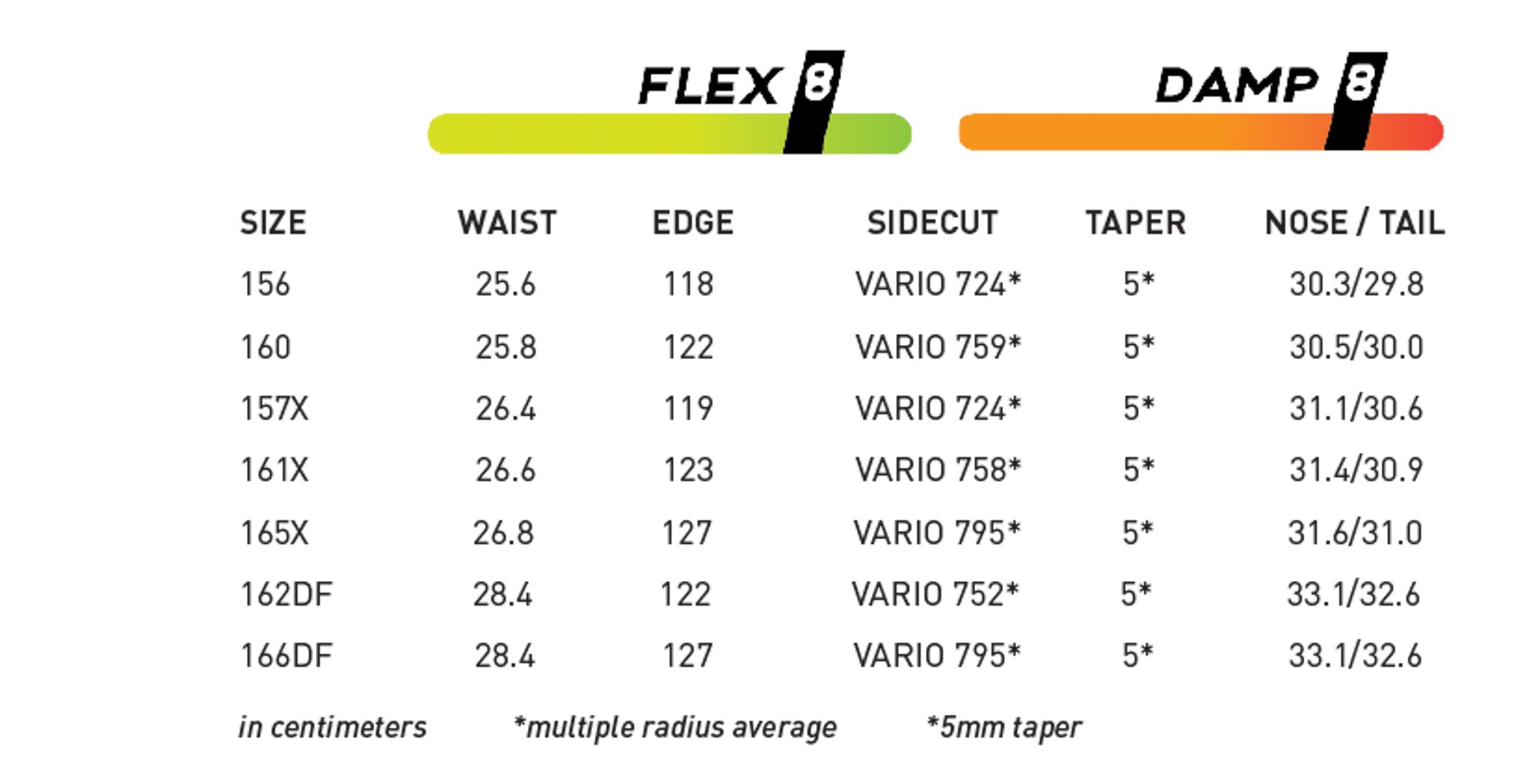 | Board Size (cm) | 156 | 160 | 157X | 161X | 165X | 162DF | 166DF |