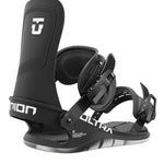 Union Women's Ultra Snowboard Binding - A black snowboard binding with a white logo on the top strap and silver buckles.